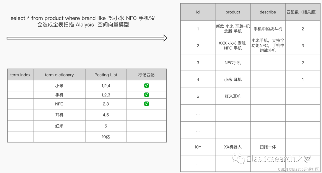 当我们按照上述所说进行一定的分词策略创建倒排索引之后,假如最终的结果就如上面图中所示。此时加入用户搜索的关键词为“小米NFC手机”,按照相同的分词策略,用户的搜索词会被分成“小米”、“NFC”、“手机”三个词项,我们分别对三个词项在左侧表格也就是我们暂时理解的“倒排索引”文件中进行检索。此时的查询由原本的模糊查询编程了精准查询,比如“小米”这个关键词,匹配到了就是匹配到了,如果匹配到了也没必要继续检索下去了,因为后面不可能再有相同的词项了。这种查询会大大加快查询的速度,比如“小米”这个关键词,最好的情况可能只匹配了第一次就命中了索引,假如元数据有10亿条,并且在这10亿数据中可能包含“小米”这个关键词的数据超过了100W行,那么本次查询只检索了一次就找到了元数据中包含“小米”这个关键词的一百万+条数据,不可谓不高效!当然了,检索也不可能次次都是一次命中,不过ES底层对倒排索引的检索做了大量的优化,大大提高了倒排索引的检索效率,比如Term Index就是词项字典索引,可以大大加快倒排索引的查询效率,关于词项索引(词项索引)我会在后面的内容中详细介绍,此处不再赘述。
