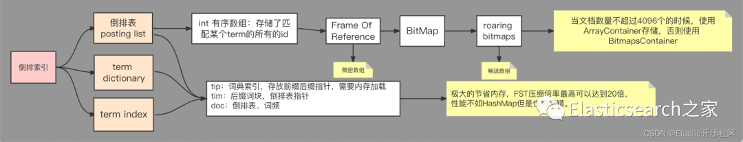 关于倒排表的文件结构,我们仅需知道其内部存储了包含Term的id数组、词频、postion、payload、offset等信息,需要重点注意的是ES内部采用怎样的压缩算法。这一点在下一节内容展开来讲。