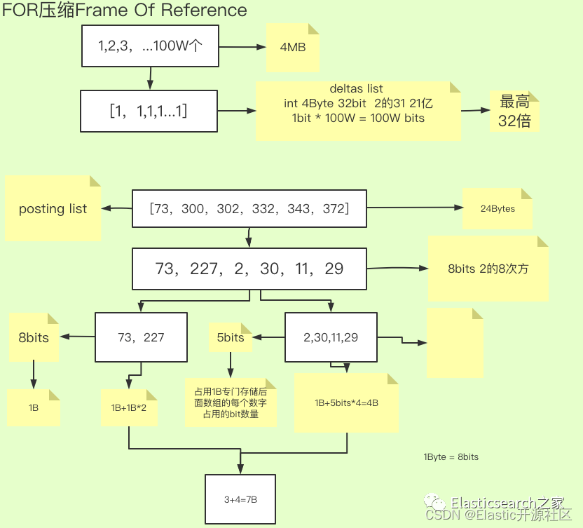 最后我们来计算一下经过压缩后的磁盘占用。数组经过拆分,分为了两个数组,第一个数组每个数字占用1个Byte,共两个数字,总占用为2Bytes,记录数组单位大小的Record Space大小为1Byte,第二个数组每个数字占用5个bit,一共四个数字,共计20bit,但是计算空间的最小单位是Byte,所以实际占用的大小为3Bytes,第二个数组的Record Space大小也是1Byte,因此压缩后的数据总大小为1B+2x1B+3B+1B=7Bytes,相比压缩之前,大小不到原先的三分之一。