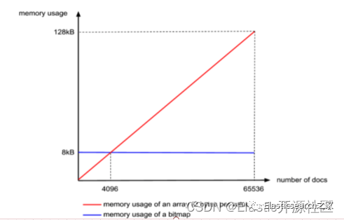 不过这种存储方式的问题就是,存储的数字不能包含重复数字,并且Bitmap的大小是固定的,不管是否存储了数值,不管存储了几个值,占用的空间都是恒定的,只和bit的长度有关系。但是我们刚才已经说过,同一个Container中的数字是不会重复的,因此这种数据类型正好适合用这种数据结构作为载体,而因为我们Container的最大容量是65536,因此Bitmap的长度固定为65536,也就是65536个bit,换算成千字节就是8KB,如图3-4中的蓝色线段所示,即Lucene的RBM中BitmapContainer固定占用8KB大小的空间,通过对比可以发现,当doc的数量小于4096的时候,使用ArrayContainer更加节省空间,当doc数量大于4096的时候,使用BitmapContainer更加节省空间。