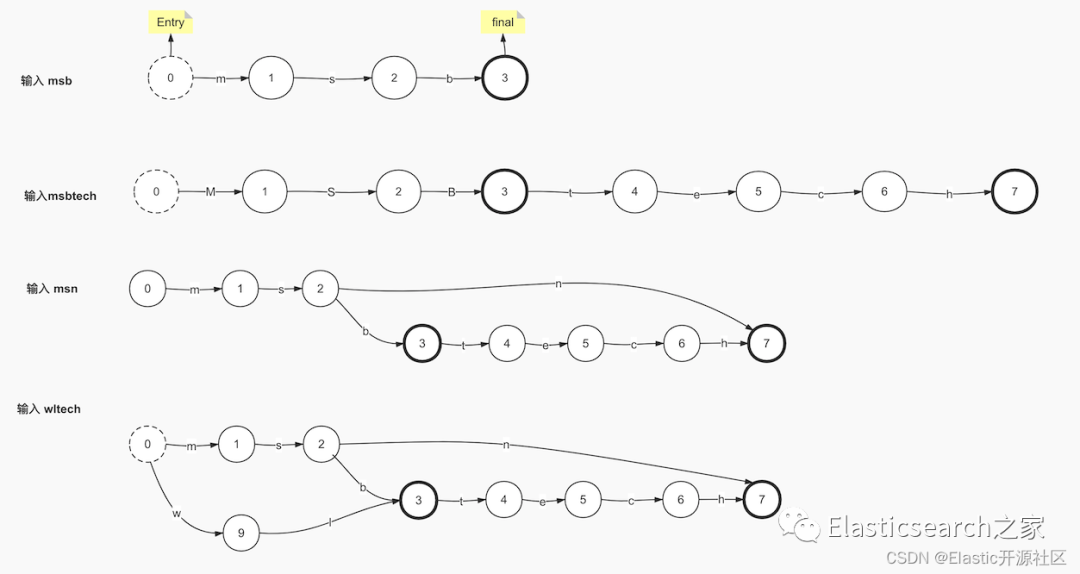 输入第三个term:msn,节点2产生了第二个出度:n,2 < 5,根据"通用最小化"法则,2和5有公共部分:2,5倍拆分成了2和3,此时公共前缀为“ms”,前面以“ms”为前缀的所有term都讲重新计算出度output,此时3需要满足:不能存放在公共前缀“ms”上,并且也不能在第二条出度“n”上,因此只能存放在出度b上,因为b在当前节点2第一条出度的链路上是最靠前的位置。这里FST和Trie最大的区别就是FST不仅使用了公共前缀,而且还计算了公共后缀,“msn”的最终节点会指向节点7,和节点6的出度h共享终止节点。