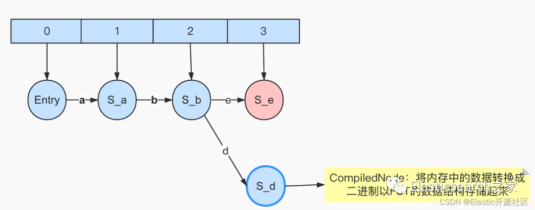 此时完整的FST对象已经构建完毕并写入current[]数组,图中展示的为十进制数字是为了方便读者理解,实际存储的完全为二进制。
