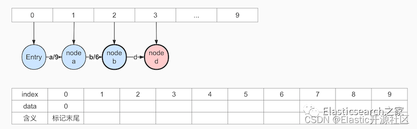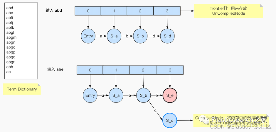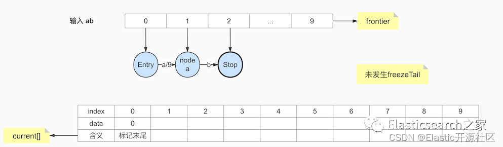 如图6-1所示,假设次数输入第一个Term,此时当前term所有的字符都不会被处理,因为FST的构建是遵循“尾部冻结”的规则的。那么什么是尾部冻结呢?首先我们知道FST最终会被构建成一个FST对象,那这个对象最终转换成二进制对象存储在一个BytesStore对象中,,在Lucene 8.7.0中,BytesStore中封装了一个byte[]类型的数组:current,current数组就是专门存储经过处理之后的节点(CompiledNode)的,当然经过处理后的节点以及其出度的信息都会被转换成二进制存储在current数组中,BytesStore可以理解为是一个字节数组的增强版,是新版本Lucene对current数组的优化,当构建的FST对象大于1GB的时候就会使用BytesStore可以理解为是一个字节数组的增强版对象来存储,否则使用current数组。那么什么时机才是“Compiled”这个动作最好的时机呢?也就是什么时候才是我们从CompiledNode数组中摘下来节点并且计算结果存放在current中的最好时机呢?当然就是等当前节点不会再发生任何变化的时候,因为只有当节点的所有属性都不再发生改变的时候,记录它的描述才是有意义的。那什么时候才能确定它不再会发生改变了呢?以图4-1中的Term Dictionary为例,FST的构造器Builder会在输入第一个term的时候在其构造函数中创建一个长度为10的默认的frontier数组: