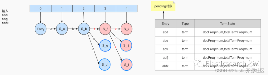 private static final class PendingTerm extends PendingEntry {public final byte[] termBytes;public final BlockTermState state;public PendingTerm(BytesRef term, BlockTermState state) {...}@Overridepublic String toString() {...}}private static final class PendingBlock extends PendingEntry {public final BytesRef prefix; //block前缀的长度(有leading label需要+1)public final long fp; //block在tim文件中的起始位置public FST<BytesRef> index; //第一个PendingBlock的FSTIndex的二进制对象public List<FST<BytesRef>> subIndices; //PendingBlock中嵌套的PendingBlock集合public final boolean hasTerms; //是否包含至少一个完整的的Term(即"非Block"也就是PendingTerm)public final boolean isFloor; //是否是floorBlock,即层级块public final int floorLeadByte; //即leading label 如果不是floor block生成的PendingBlock 那么返回-1...}