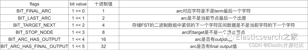 public final class FST<T> implements Accountable {...// arc对应的label是某个term的最后一个字符private static final int BIT_FINAL_ARC = 1 << 0;// arc是Node节点中的最后一个Arc,一个UnCompiledNode状态的Node可以包含多个arcstatic final int BIT_LAST_ARC = 1 << 1;// 当前Arc的Target节点就是上一个处理的节点 或者理解为// 存储FST的二进制数组中紧邻的下一个字符区间数据是不是当前字符的下一个字符static final int BIT_TARGET_NEXT = 1 << 2;// TODO: we can free up a bit if we can nuke this:// arc的target是一个终止节点private static final int BIT_STOP_NODE = 1 << 3;/** This flag is set if the arc has an output. */// arc有Output valuepublic static final int BIT_ARC_HAS_OUTPUT = 1 << 4;// arc有Final Output valueprivate static final int BIT_ARC_HAS_FINAL_OUTPUT = 1 << 5;...}