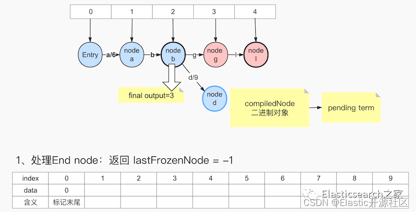 这里需要注意,我在描述lastFrozenNode的概念的时候说过,当前处理的Arc d指向的节点在current数组中的起始位置和astFrozenNode的值不相同的时候并且Arc d指向的节点不是Stop node的时候,需要记录当前Arc的下一个Arc(按照label在term中的顺序)在current数组中的坐标:target index,但是当前处理的Arc d指向的节点是Stop node,因此也就不必记录target index。