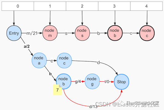 处理顺序:节点从后往前,Stop Node => node g(arc:l)=> node b(arc:d、g)