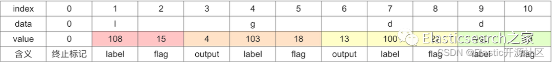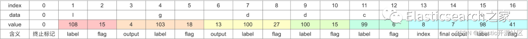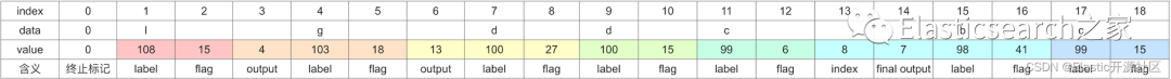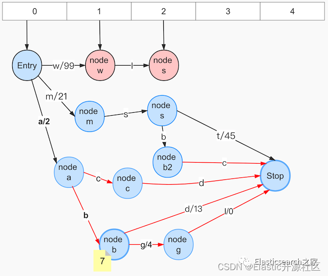 1.从index:39开始,此时key = 'a',当读到index : 36,此时target index指向16,index : 16的位置存储的label为'b',此时key = "ab",final output = 7即可判断当前为终止节点,这里就不用计算flags了,即此时读取到term:ab,此时Term Dictionary中包含一个term:ab,value = 2+7,即:term:ab/9。2.由于index : 16中index指向index : 8,此时key = abd,flags = 27,27有唯一的flag组合:16 + 8 + 2 + 1,即BIT_ARC_HAS_OUTPUT、BIT_STOP_NODE、BIT_LAST_ARC、BIT_FINAL_ARC的组合,由BIT_STOP_NODE可得当前是终止节点,所以此时读取到term:abd,value = 2 + 13 = 15 ,即:term:abd/15。此时Term Dictionary中包含两个元素:term:ab/9、term:abd/15。3.由于index : 8的Arc d没有target index,因此继续沿着数组往下读,即读取index : 5,即Arc g,通过前面的flags值计算可得此时key = "abg", Arc g仍然没有target index,因此继续读取index : 2,同理可得此时key = "abgl",继续读或者通过flags都可以判断当前是一个终止节点,所以此时得到term:abgl,value = 2 + 4 = 6,即term:abgl/6。此时Term Dictionary中包含三个元素:term:ab/9、term:abd/15、term:abgl/6。4.此时node a的第一个出度Arc b已经遍历完毕,即index : 16后面的数据已经读取完毕,此时读取'b'在current数组中的顺序数据,即index : 12,原理同上,读至index : 10,由flags可得当前为终止节点,此时得到term:acd/2。此时Term Dictionary中包含四个元素:term:ab/9、term:abd/15、term:abgl/6、term:acd/2。5.此时Entry的第一个出度Arc a的所有信息都已经遍历完成,即index : 39的target index后面的数据以及读取完毕,按照current数组顺序读取至index : 35,根据其target index : 26读取到Arc s,顺序读至index : 24,根据其target index读至index : 18,再根据当前Arc c的flag的到term:msbc,value = 21。即:term:msbc/21。此时Term Dictionary中包含五个元素:term:ab/9、term:abd/15、term:abgl/6、term:acd/2、term:msbc/21。6.此时node s的第一个出度Arc b遍历完毕,沿着Arc b顺序读取至index : 21,计算flags可得当前节点为Stop node,即得到term:mst,value = 21 + 45 = 66,即term:mst/66。此时Term Dictionary中包含六个元素:term:ab/9、term:abd/15、term:abgl/6、term:acd/2、term:msbc/21、term:mst/66。7.此时Entry的第二个出度Arc m的所有信息已经读取完毕,沿着index : 35继续往后顺序读取,读取index : 31,然后顺序读取至index : 28,通过计算flags可得当前节点为终止节点,即得到term:wl,value = 99,即term:wl/99,此时Term Dictionary中包含七个元素:term:ab/9、term:abd/15、term:abgl/6、term:acd/2、term:msbc/21、term:mst/66、term:wl/99。