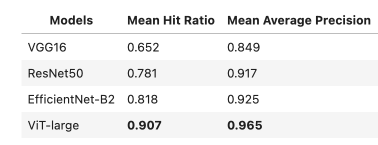 Towhee 的 image-embedding ⁴算子涵盖了市面上主流的各种模型,通过修改算子参数,可以轻松调用任何模型,而无需额外的折腾。此外 Towhee 还提供关于 Recall、HR 和 mAP 等指标的计算和报告,我们可以基于自己的数据集来对比不同模型的指标结果,从而帮助选择最优的模型。例如我们指定三个模型 ( VGG16, resnet50 和 efficientnet-b2 ) 进行测试并对比,先将图像数据集入库,然后搜索测试图片并返回搜索结果的准确率报告: