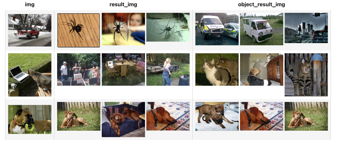 在进行有无目标检测的结果对比之后,我们可以发现一个有意思的事情:在某些情况下,目标检测后的结果更优。以下图中每一行的结果为例,从左至右是我们输入的检索图片,和三张图搜的结果、进行目标检测后搜索的结果。第一行在加上目标检测后才能找到车相关的图片,否则都是蜘蛛,我们可以推测 ResNet 把待检索图片中的树枝理解成了蜘蛛,但是在 Towhee 流水线中应用上目标检测就可以解决这个问题。