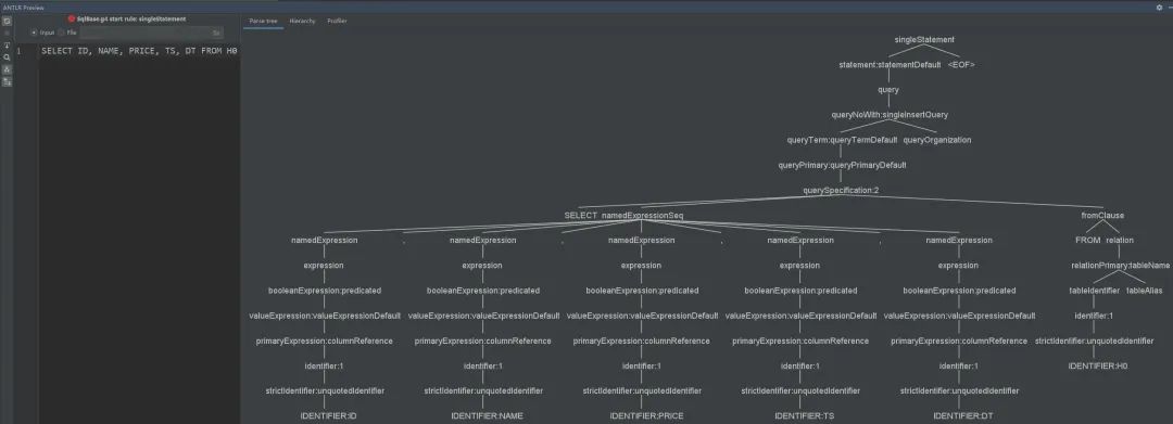 因为select 对应的嵌套逻辑比较复杂,我们可以利用IDEA里的ANTLR插件测试一下singleStatement