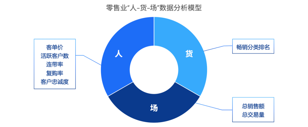 传统零售业的数据分析本质上离不开“人-货-场”这一模型,“人-货-场”从不同角度对零售业做了数据指标和分析维度的提炼,横向的完整性上有了充分展开: