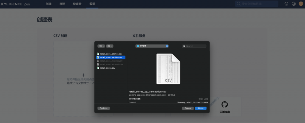 Kyligence Zen 支持对接多种类型的数据源,这里我们以 CSV 文件为例,导入交易和客户这两个数据集。