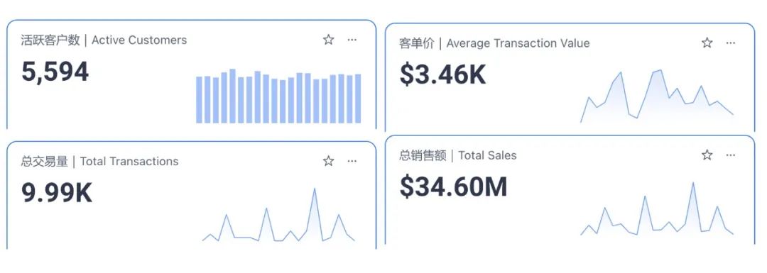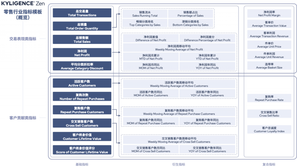 在 Kyligence Zen 中,大家可以通过 YAML 格式的文件来维护指标定义并一键导入,这里我们已经为大家准备好了一套完整的零售行业指标模板(大家可点击文末「阅读原文」免费获取)。该模板包含交易表现和客户贡献这两大视角的 30 多个典型应用指标,当然也包括我们设定的“北极星指标”里所需要的总销售额、总交易量、客单价和活跃客户数。