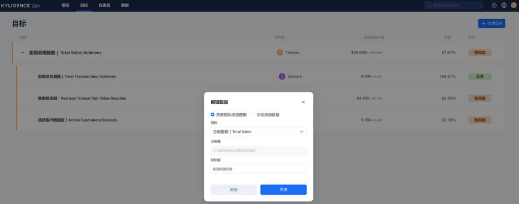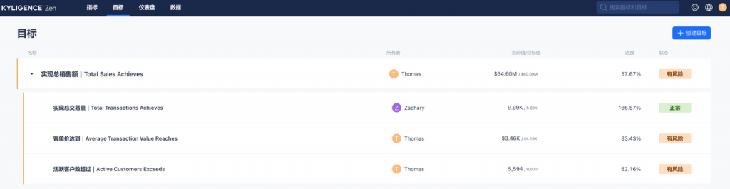应用“北极星指标”的关键意义之一在于优先聚焦在最核心的业务目标上,所以在落地平台上就需要体现出业务目标和对应指标的联动。在 Kyligence Zen 里,我们可以通过创新的目标管理这一关键能力来追踪设定的“北极星指标”和拆解后关联指标的执行情况;更为重要的是,能够在建立业务目标并绑定到具体指标后,第一时间看到当前差距和风险。