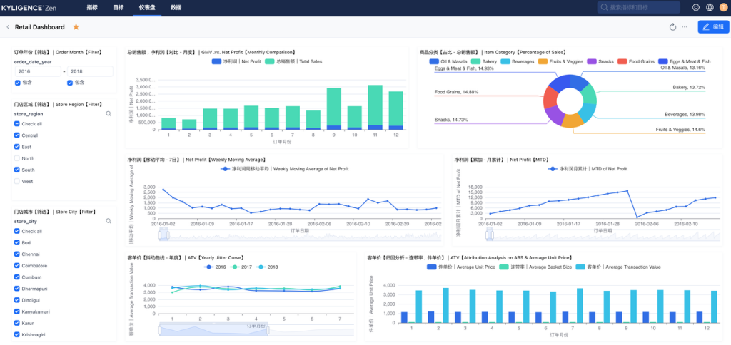 这样我们就可以从更贴合业务思维的角度出发,直接从指标库中选择需要的指标:比如对于客单价可分析其关联指标连带率产生的影响;又比如对于活跃客户数可观察其关联指标复购率如何发挥作用;所有的这些指标口径一致,都可以按时间维度(如订单日期)、空间维度(如门店位置)和属性维度(如商品分类)进行组合分析,大家可以导入我们准备的零售行业指标模板并根据典型的零售场景来进一步探索。