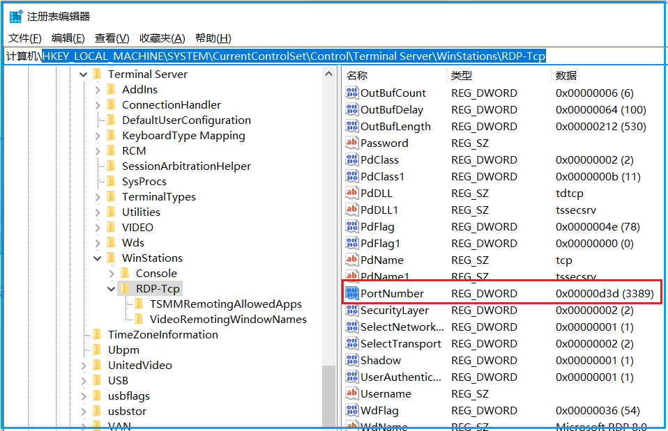 Windows Registry Editor Version 5.00[HKEY_LOCAL_MACHINE\SYSTEM\CurrentControlSet\Control\Terminal Server\WinStations\RDP-Tcp]"PortNumber"=dword:00000d3d