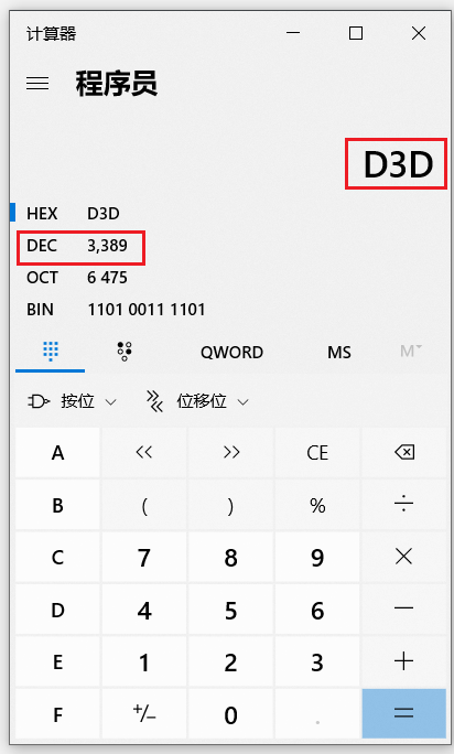 比如 0xd3d ,在程序员版计算器中,进行进制转换,十进制为 3389