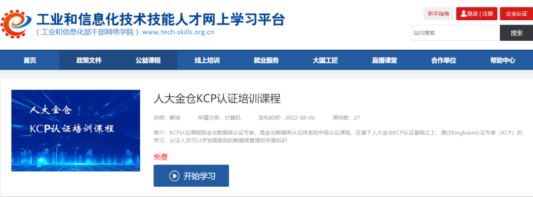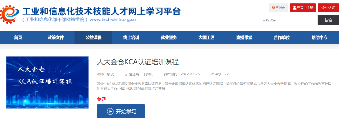 人大金仓凭借着丰富的人才培养实践经验和深厚的技术底蕴成功入选为“工业和信息化线上培养工程”合作单位。由金仓出品的《人大金仓KCA认证培训课程》以及《人大金仓KCP认证培训课程》已被工业和信息化部教育与考试中心采用,目前已上线工业和信息化技术技能人才网上学习平台(简称学习平台)