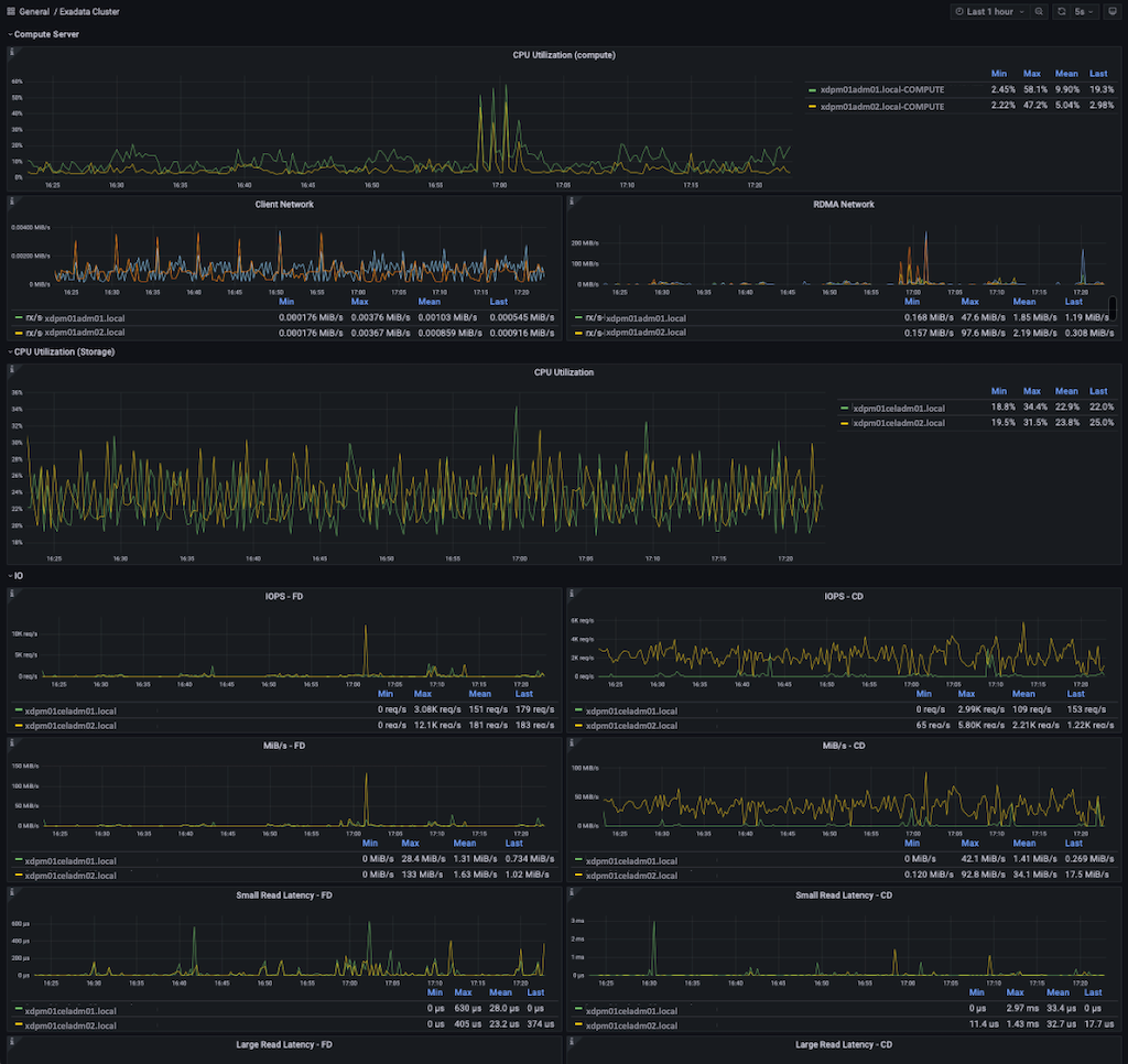 Exadata 22.1 Real-Time Insight这个新特性为我们带来了一种全新的综合监控解决方案,支持将Exadata运行指标纳入Grafana的仪表盘中统一展示管理。下图是Exadata 运行指标在Grafana仪表盘的演示效果: