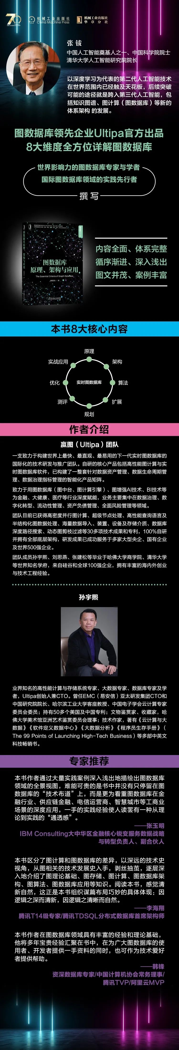 在数据库与人工智能的发展历程中,笔者结合自己过去二十几年间作为一名硅谷IT老兵和中关村科技创业者的亲身经历,预见到图数据库与(实时)图计算技术不仅会占一席之地,更会成为一种主流的甚至终极的数据库,并赋能新一代的人工智能蓬勃发展。本书是笔者对过去几年间沉浸图数据库研究的感悟与阶段性总结的梳理,希望分享给更多志同道合的朋友。(孙宇熙)
