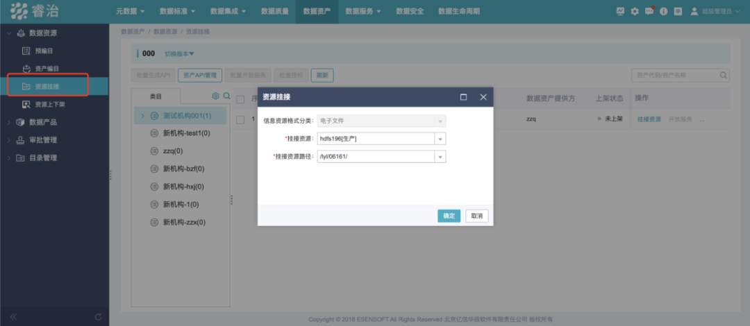 - 兼容HDFS,数据资产编目、数据资源挂接、添加数据资产上传文件、智能编目都支持选择HDFS类型资源。