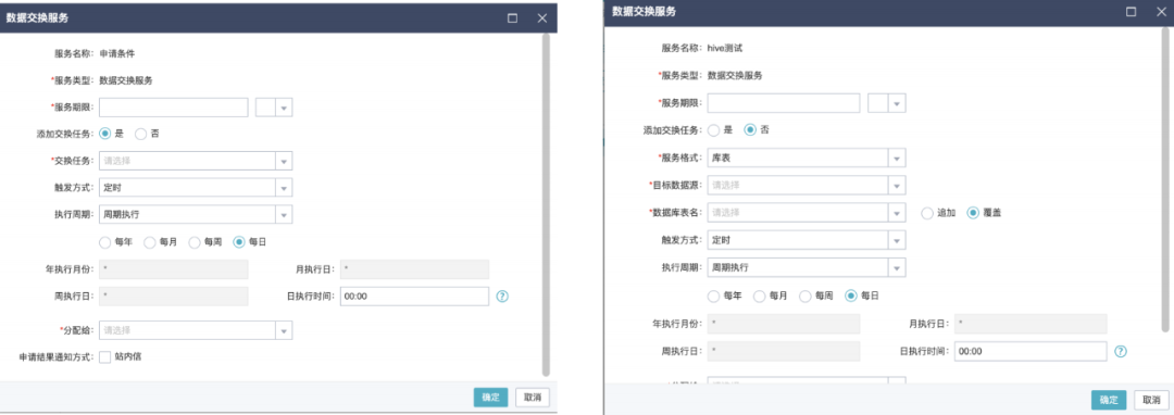 数据资产【手动添加数据资产】、【资源挂接】对非结构化资源进行挂接时,可以选择到 HDFS数据源。特性4:数据资产/资源挂接设置授权服务自动生成任务/任务流应用场景:管理员在分配数据交换服务时,系统需要根据管理员设置的【目标数据源】、【数据库表名】/【文件路径】自动生成对应到任务/任务流。