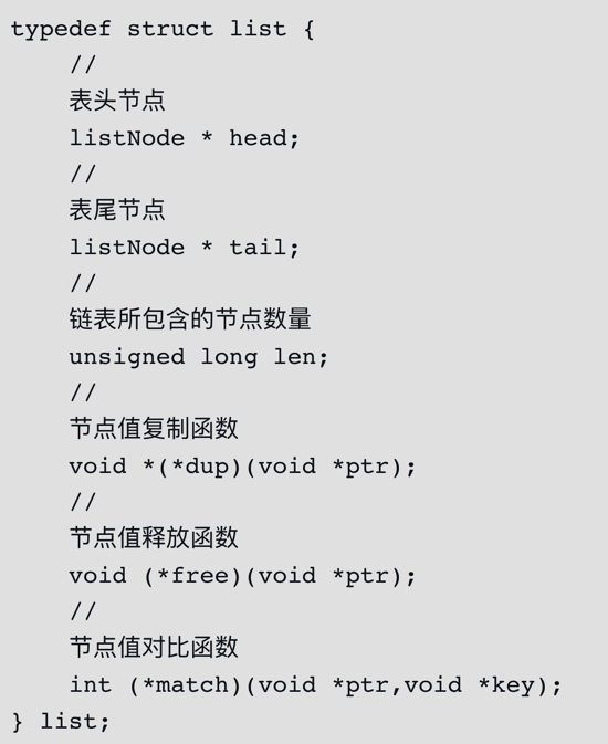 双端:链表节点带有 prev 和 next 指针,获取某个节点的前置节点和后置节点的复杂度都是 O(1)。 无环:表头节点的 prev 指针和表尾节点的 next 指针都指向 NULL,对链表的访问以 NULL 为终点。 带表头指针和表尾指针:通过 list 结构的 head 指针和 tail 指针,程序获取链表的表头节点和表尾节点的复杂度为 O(1)。 带链表长度计数器:程序使用 list 结构的 len 属性来对 list 持有的链表节点进行计数,程序获取链表中节点数量的复杂度为 O(1)。 多态:链表节点使用 void* 指针来保存节点值,并且可以通过 list 结构的 dup、free、match 三个属性为节点值设置类型特定函数,所以链表可以用于保存各种不同类型的值。