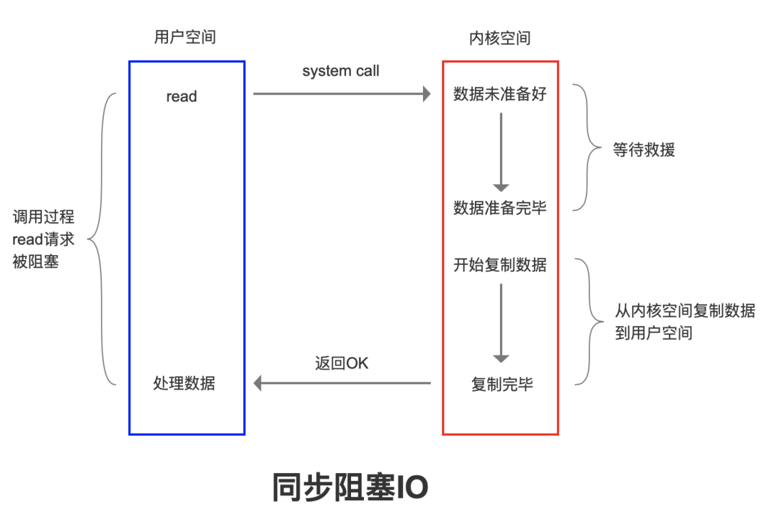 阻塞的原因由于使用传统阻塞 IO ,也就是在执行 read、accept 、recv 等网络操作会一直阻塞等待。如下图所示: