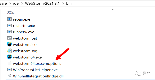 将下来我们找到 IDE 安装目录下的 vmoptions 文件。不管你用的是 IDEA、WebStorm 还是其它的,名字都叫 xxx64exe.vmoptions