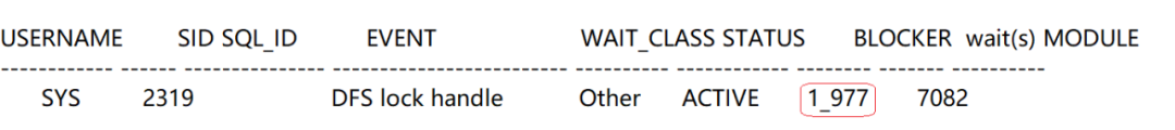 检查3号节点的2319 session,发现被1号节点的977 session阻塞,同样等待DFS LOCK。
