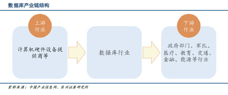数据库上游主要包括计算机硬件设备、软件等产品。主要包括:小型机、微型机、存储设备、交换机、路由器和物联网感知设备等。数据库下游已经广泛应用到各个行业,政府及金融、能源、教育、交通等领域。