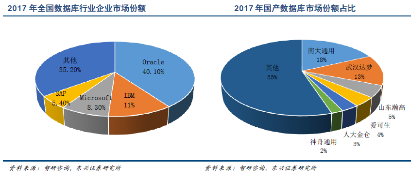 在数据库领域,数据库技术门槛较高,国外数据库企业Oracle、IBM 和微软三家厂商占据市场份额近六成。其中Oracle 占比最高,为40.1%,而IBM 和微软紧随其后,分别为11%和8.30%。而在我国数据库市场中,国产数据库市场份额为14.27%。其中,南大通用和武汉达梦市场份额相对较高,为18%和13%。其余国产数据库企业如山东瀚高,爱可生,人大金仓,神舟通用等在国产数据库市场份额中占比均不超过5%,可见国产数据库存在相对激烈的竞争,不同企业都在致力于提高市场份额。