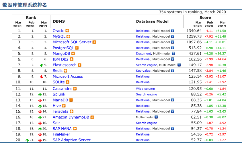 DB-Engines根据数据库管理系统受欢迎程度对其进行排名,每月更新一次。在2020年03月最新排名中,Oracle 位列第一,MySQL 和Microsoft SQL Server 紧随其后,分别为第二和第三名。在中国市场份额较大的IBM DB2 位列第六名,SAP 的HANA 和Adaptive Server 则分别处于第十八和二十名。