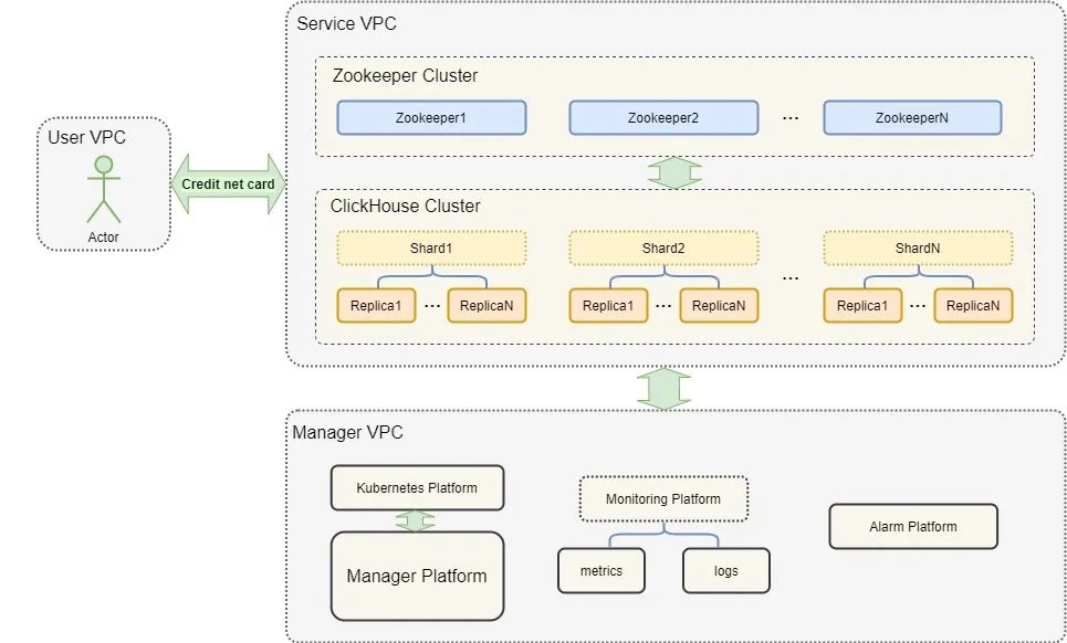 JCHDB采用Zookeeper集群和ClickHouse集群的组合方式结合ReplicatedMergeTree表引擎来提供多副本机制,使多副本实现单写,并且多节点异步同步数据。这样可确保数据的冗余存储,保证数据的高可用性。JCHDB通过用户VPC、服务VPC和管理VPC互相隔离的方式保证ClickHouse节点的数据安全性。同时,JCHDB通过将丰富的指标及日志数据对接到统一监控平台,实现了数据库节点对用户的可观测性,可使用户更加透明安心地使用JCHDB。