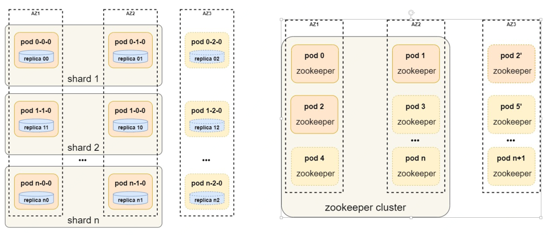 JCHDB会根据用户对可用区的选择实现不同的调度方式,如果用户选择3副本3可用区,则会将3个副本节点调度到3个可用区,如果多余3个节点,会在此基础上再近似均分的方式进行调度。ClickHouse和Zookeeper节点都是类似的调度方式。如果用户选择了单可用区,也会保证同分片的不同副本节点不会被调度到同一台物理机。用户可以根据自己的需求自行选择可用区配置。