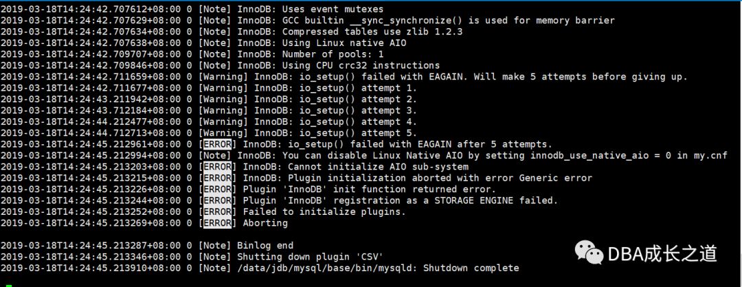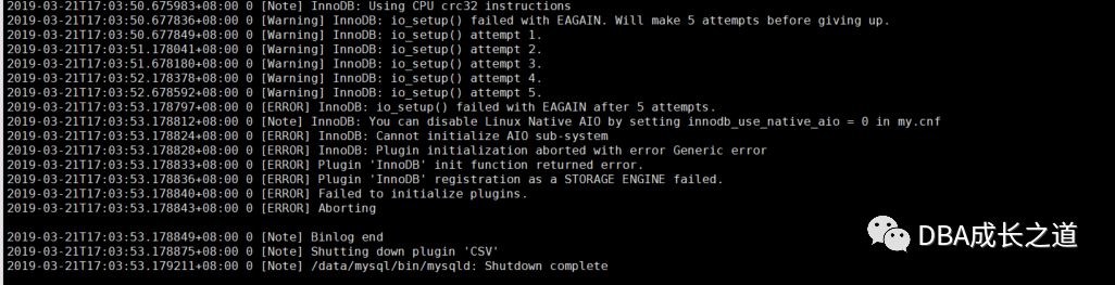 Note:可以设置innodb_use_native_aio=0来禁用linux Native AIO(mysqld很讲究,在关掉自己之前还挣扎着告诉我可以怎么做)