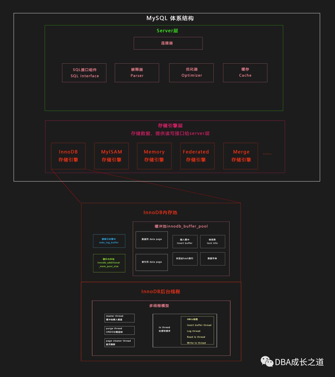 回答这个问题之前我们先看粗略复习一下MySQL和innoDB的体系结构: