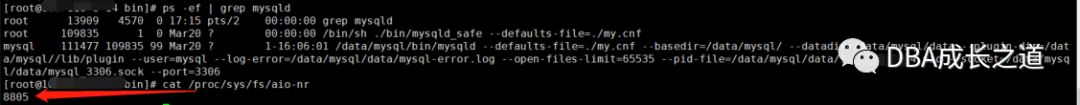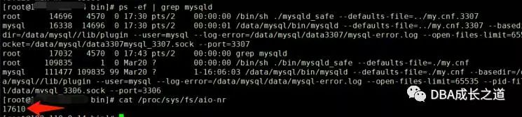 (1)首先我在一台服务器启动了两个数据库实例3306和3307,检查了一下启动两个数据库实例的时候aio-nr 是17610(8805*2),关掉3307的mysql实例后aio-nr是8805