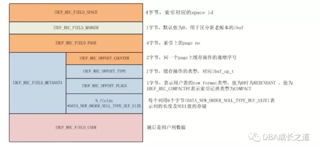 上图是一条ibuf记录的存储格式,通过(space id, page no , counter)三列作为主键来唯一决定一条记录,其中counter是一个递增值,目的是为了维持不同操作的有序性。可以通过counter来保证merge时执行时的顺序和用户操作的顺序一致。