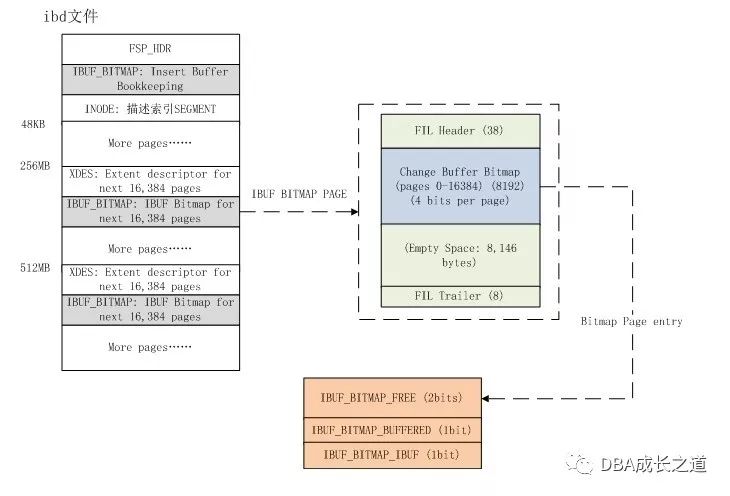 针对满页情况,则是通过ibuf_bitmap页记录,该页存在于每个ibd的固定位置;ibuf_bitmap中记录了每个数据页的缓存状态和空闲空间大小。