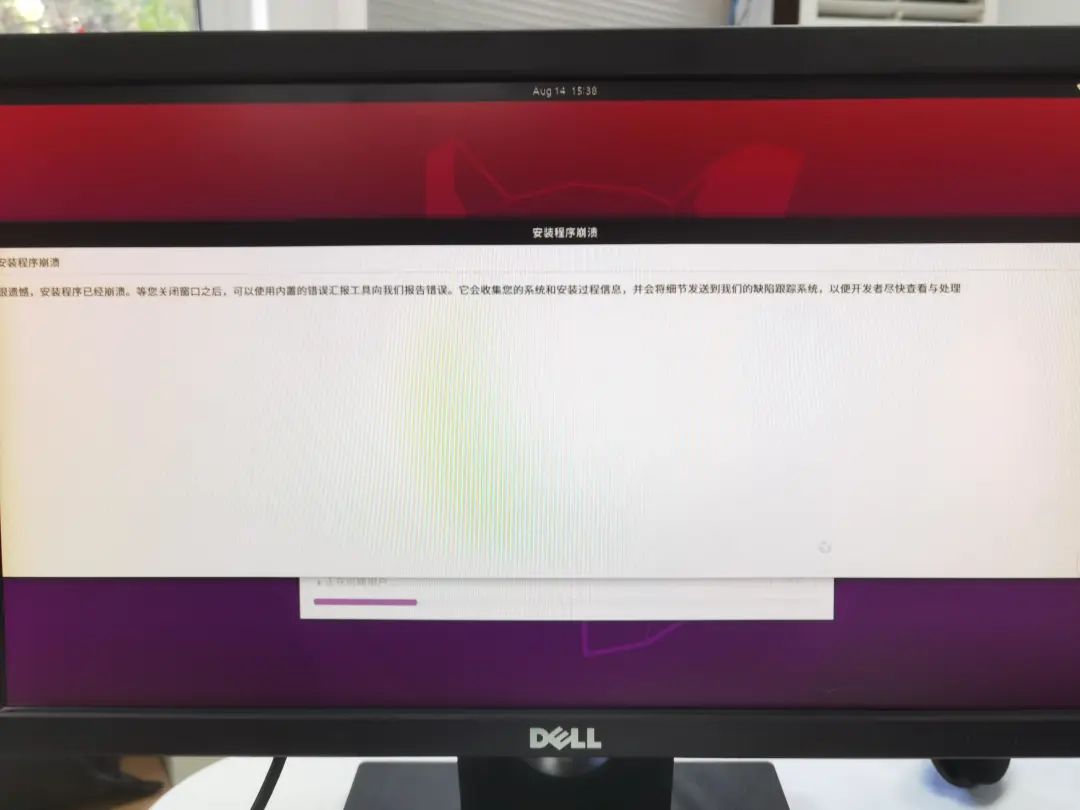 那次装机经历可以说是极其曲折了,所以趁着周末,我就拖了台机器过来测试重装系统,Windows安装很顺利,后来Ubuntu安装的时候又遇到问题了。。。我想着既然上次装16.04不行,装20.04可以,那我这次就还装20.04吧,结果顺利安装到最后却告诉我安装程序崩溃了?