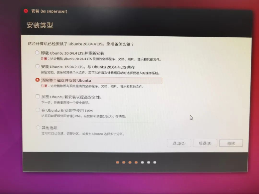 这步因为是重新安装新系统,而不是安装双系统,所以需要清除整个磁盘,选第三个,继续。(双系统安装我还没试过,以后有机会可以再出一期教程)