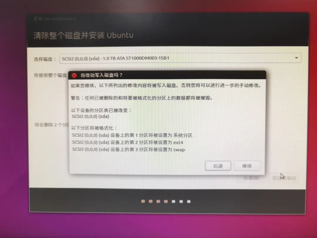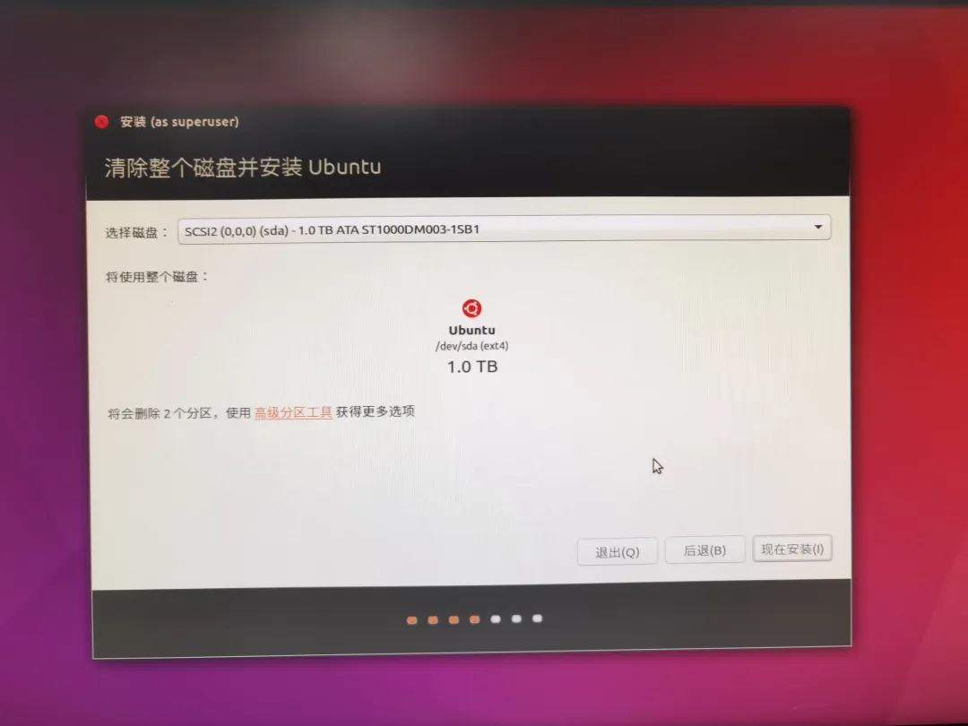 选择系统安装的磁盘,点击现在安装。(网上不少教程这里是建议使用高级分区工具手动给系统划分efi引导、swap等,但实际上不分也没事,而且Ubuntu分区操作还挺麻烦的,如果不是专业人士,这步还是直接跳过吧)