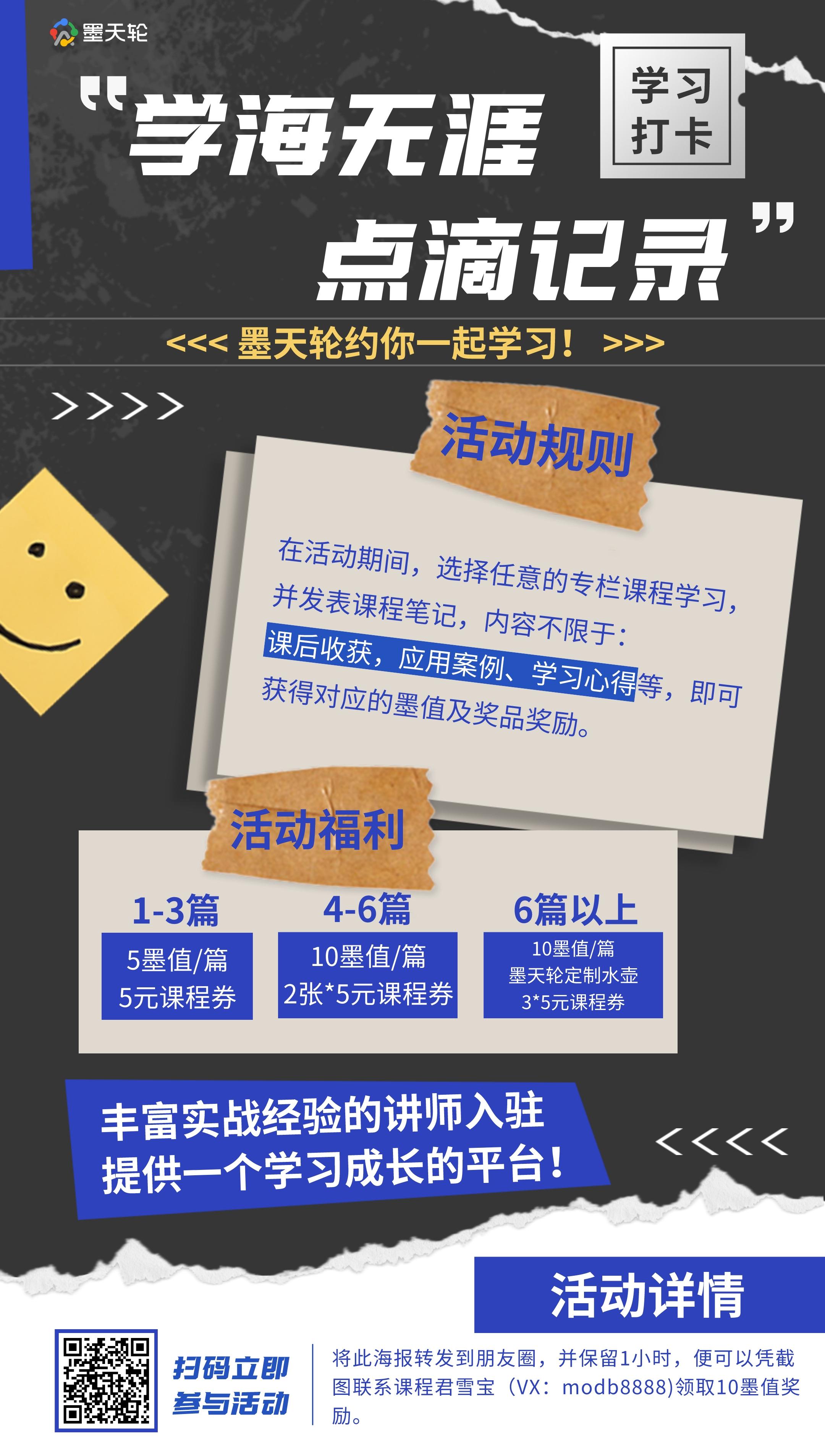 在活动期间,选择任意的专栏课程学习,并发表课程笔记,内容不限于:课后收获,应用案例、学习心得等,即可获得对应的墨值及奖品奖励。