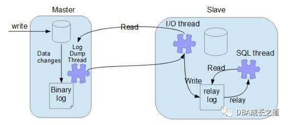 MySQL主从复制涉及到三个线程,一个运行在master(dump线程)上、另外两个(IO线程,SQL线程)运行在salve,如下图所示: