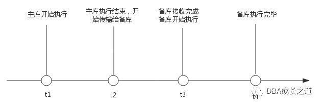 理论上主库有更新时,备库都存在延迟,且延迟时间为备库执行时间+网络传输时间即从库执行完毕时间-主库执行结束时间(t4-t2)。