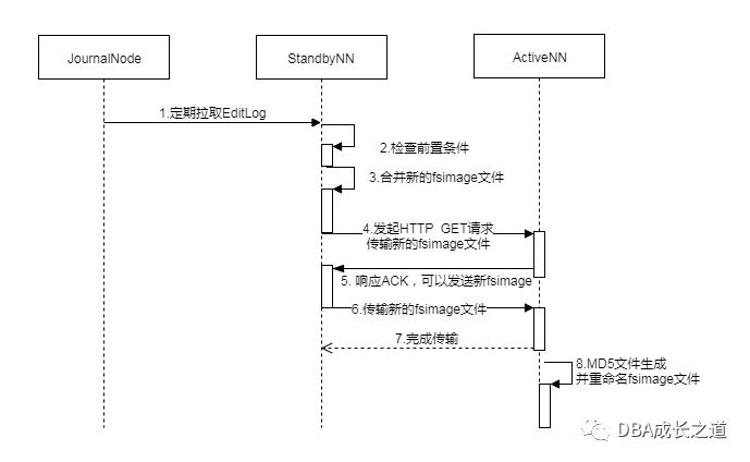 2.Standby NameNode检查达到checkpoint条件后,将该namespace以fsimage.ckpt_txid格式保存到Standby NameNode的磁盘上,并且随之生成一个MD5文件。然后将该fsimage.ckpt_txid文件重命名为fsimage_txid。PS. txid-transactionId为操作日志的事务ID
