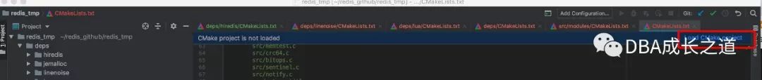 在添加完CMakeLists.txt文件之后,CLion会自动进行编译源码,编译完成之后,代码就可以debug了。有的时候CLion不会进行编译,可以手动的进行编译操作。选中redis根目录下的CMakeLists.txt文件进行手动编译。或者让编译器自己导入进行编译。