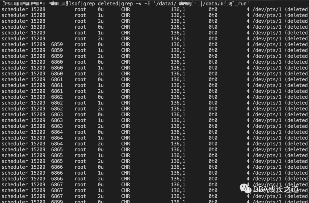 接下来检查是否有删除的文件空间未释放,通过lsof命令查看,查看结果需要过滤掉有单独挂载盘的目录。命令如下: